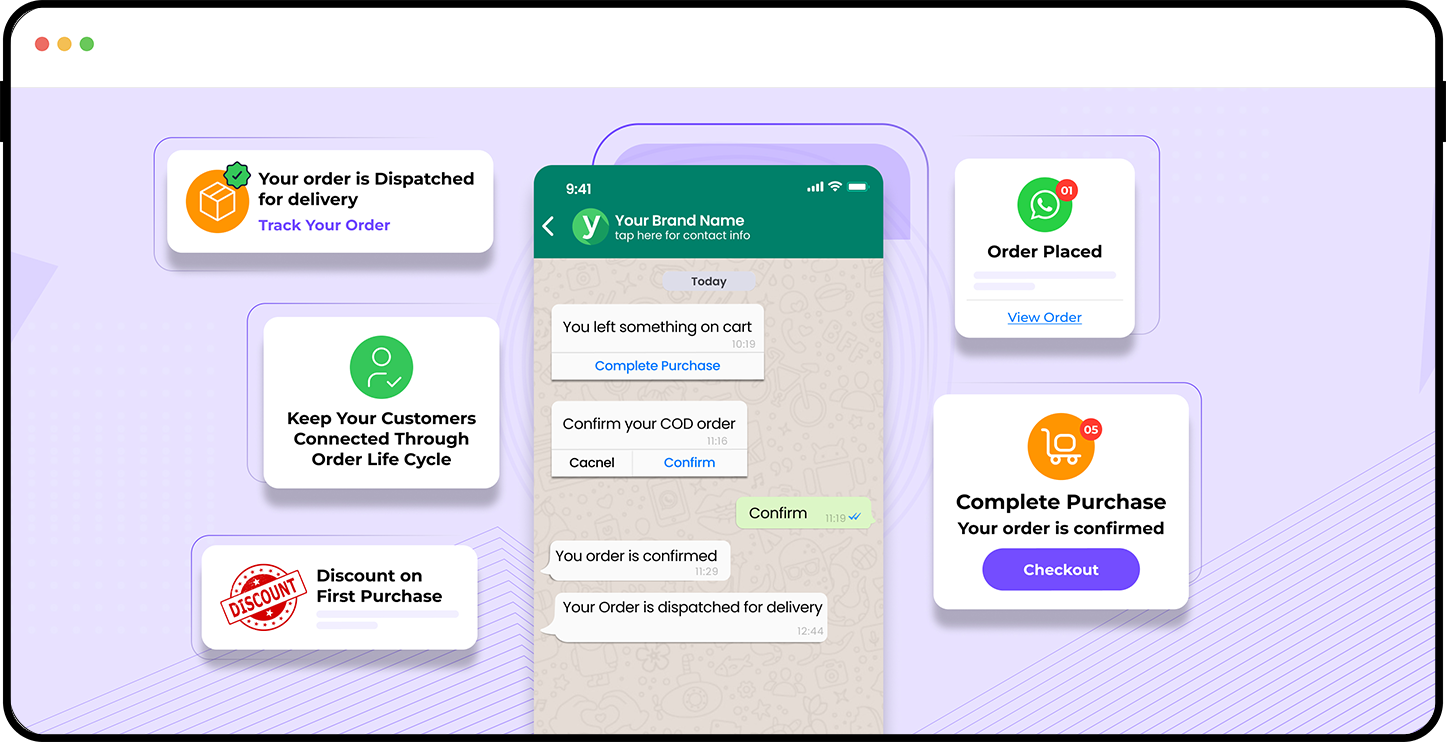 Boost conversions with Abandoned Cart recovery reminders, send confirmation and tracking updates to keep your customers informed during the complete order life cycle. Fully customizable templates on SMS and Whatsapp with Branded Notifications.