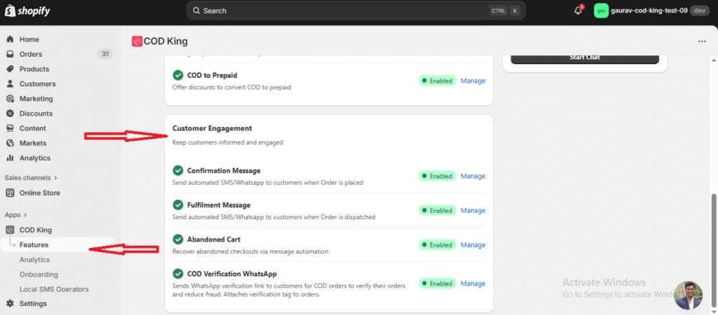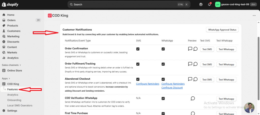 By clicking on ‘Manage’ in the customer notification section, you can enable or disable sending notifications via SMS or WhatsApp. You can also test the feature from there.