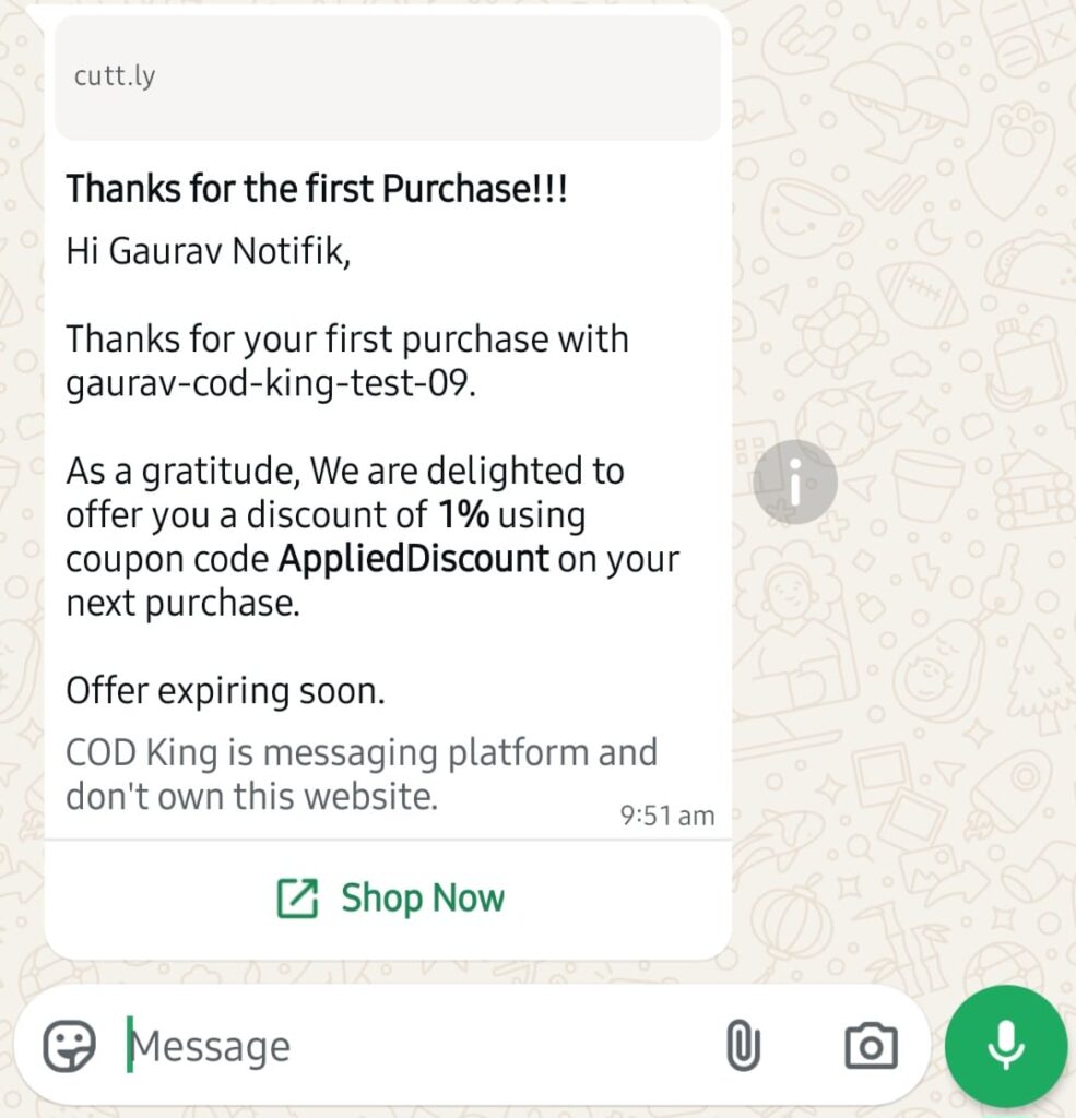 When a customer places their first-ever order, COD King sends a welcome message usually with an optional discount for their next order.