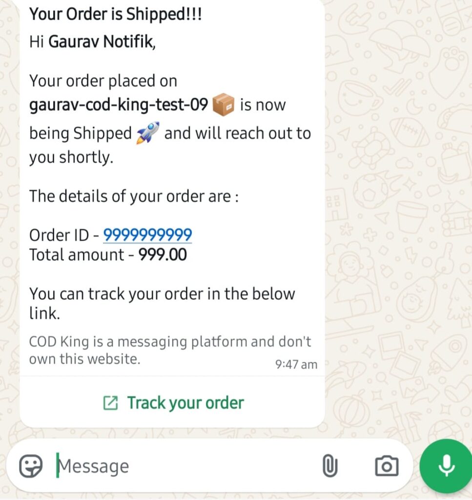 COD King provides a powerful set of automated customer notifications to keep your customers informed at every stage of their shopping journey. These notifications help increase trust, improve communication, reduce RTO, and boost conversions.