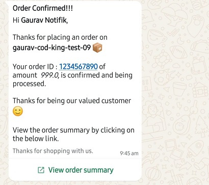 This notification is automatically sent to customers immediately after they successfully place an order (COD or prepaid).