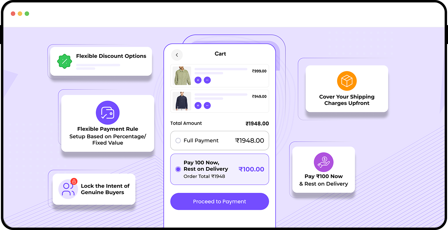 Collect upfront partial token amounts to secure your orders. Configure rules based on Percentage or fixed value. Take the conversion benefits of COD with genuine buyers.