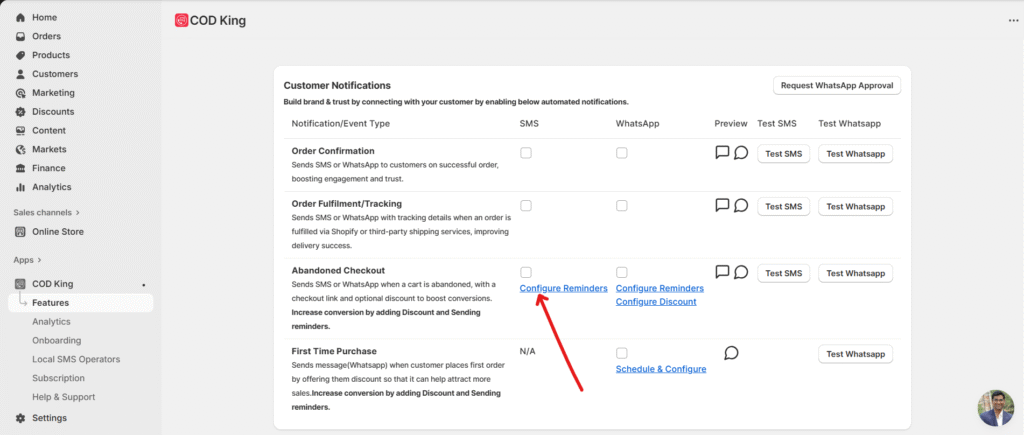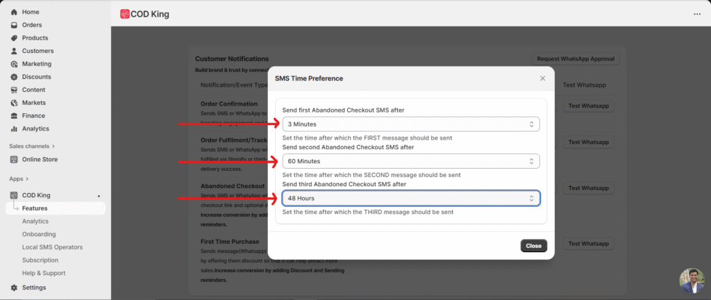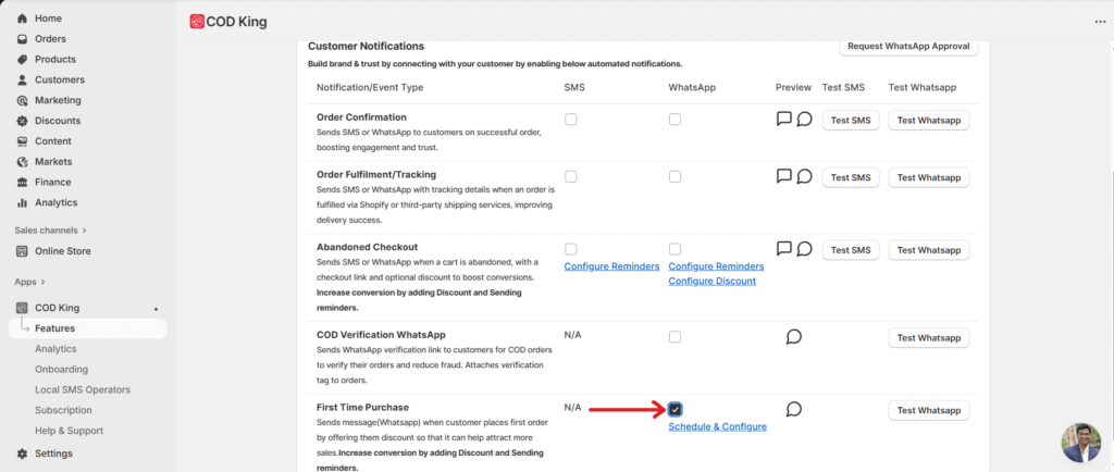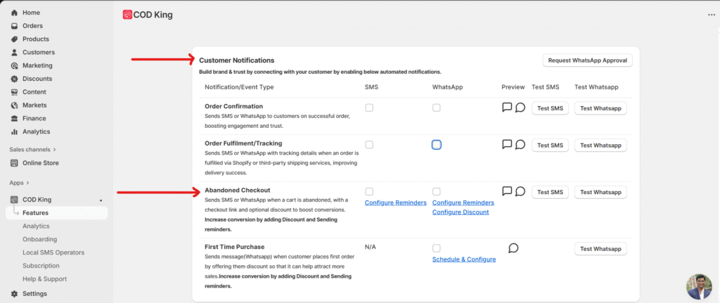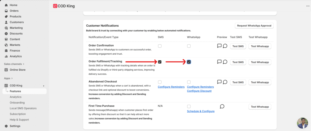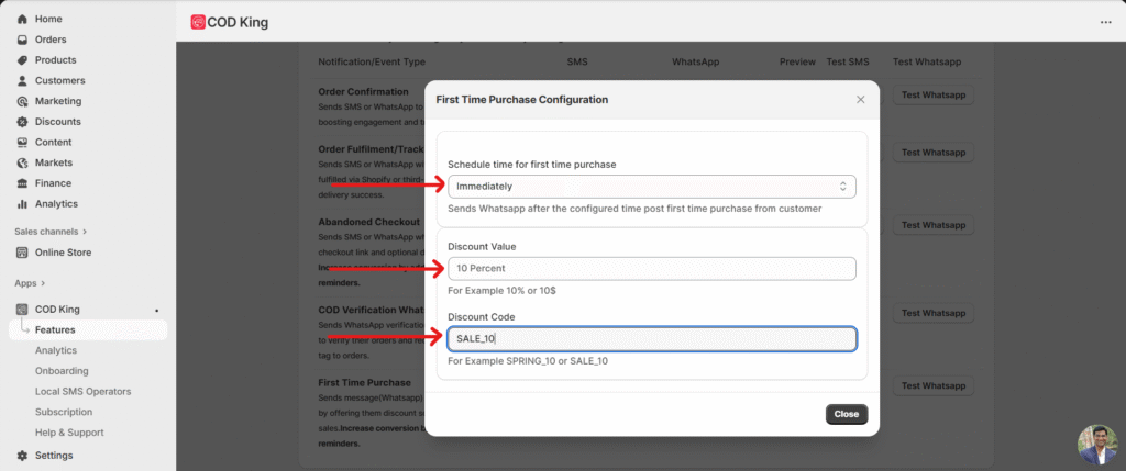 In COD King, we have a very interesting feature using which we can attract more sales. When a merchant enables this feature, our app automatically sends a message on WhatsApp to customers placing their first order, offering them a discount so that it attracts more sales and overall increases the revenue of the merchant.