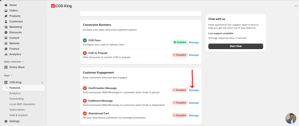 Install the ‘COD KING’ app from the Shopify App Store if you haven’t already. Once installed, navigate to your Shopify dashboard and select ‘Apps’. Click on the ‘COD KING’ app to launch it from there.